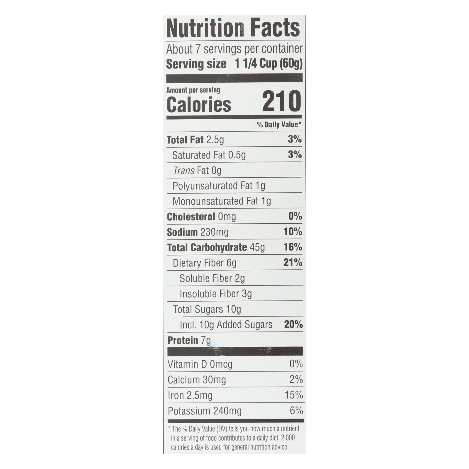 Start your day with a nourishing and satisfying breakfast with Morning Oat Crunch Cereal, Original. Each serving is a powerhouse of nutrition, offering 7 grams of protein, 42 grams of whole grains, and 5 grams of fiber. Perfect for those who value wholesome ingredients, this cereal is made with whole grain oats, wheat, and a touch of cane sugar, providing a delightful crunch without overwhelming sweetness.