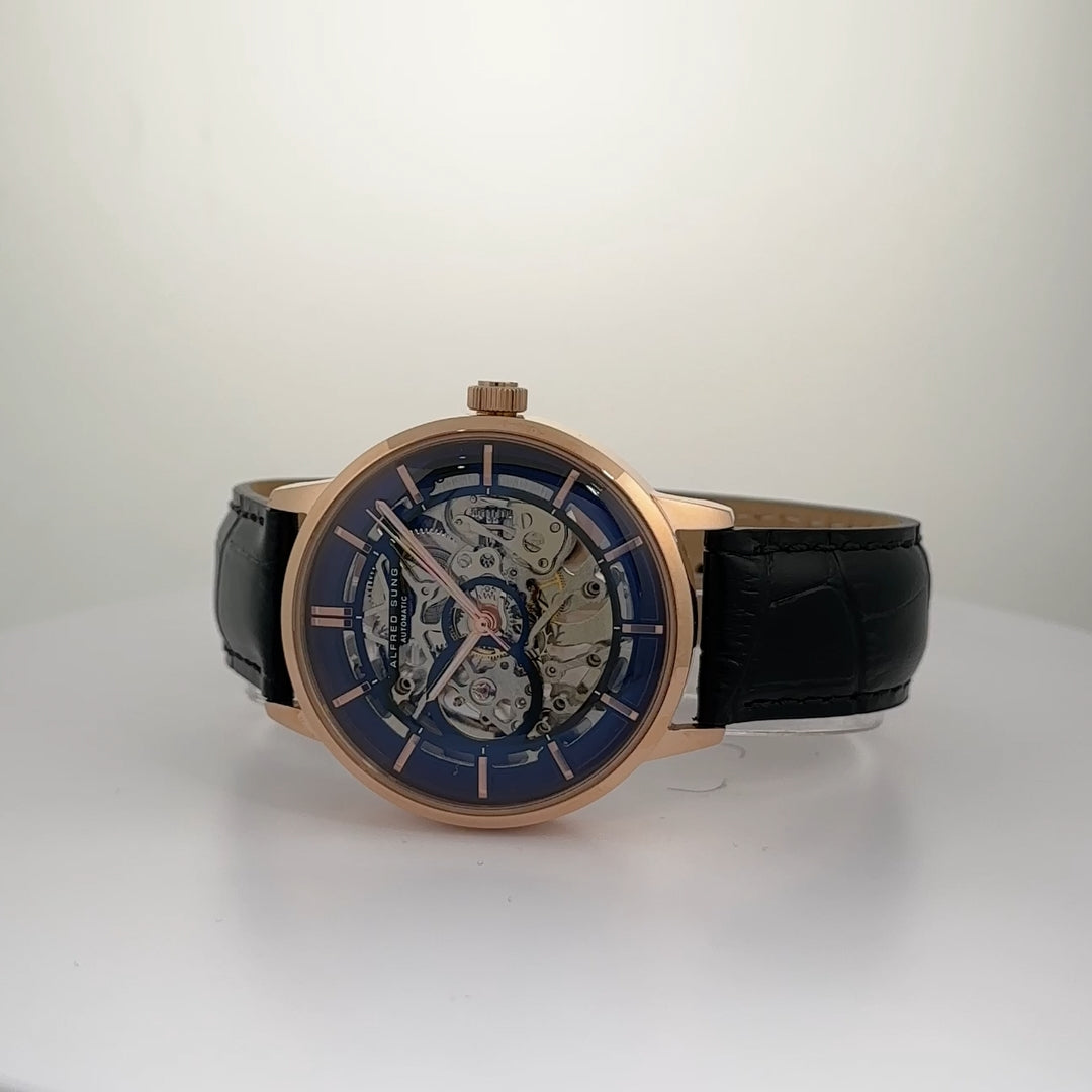 Elevate your style with the Alfred Sung Automatic III Men's Wristwatch. This striking timepiece features a 43mm round rosegold case paired with a luxurious black leather strap, exuding bold, contemporary elegance. The black skeleton dial reveals the intricate mechanics beneath, adding a modern edge, while the transparent screw-down case back showcases the precision automatic movement. With 5 ATM water resistance, this watch seamlessly blends functionality with distinctive design, making it a standout choice for the modern gentleman.