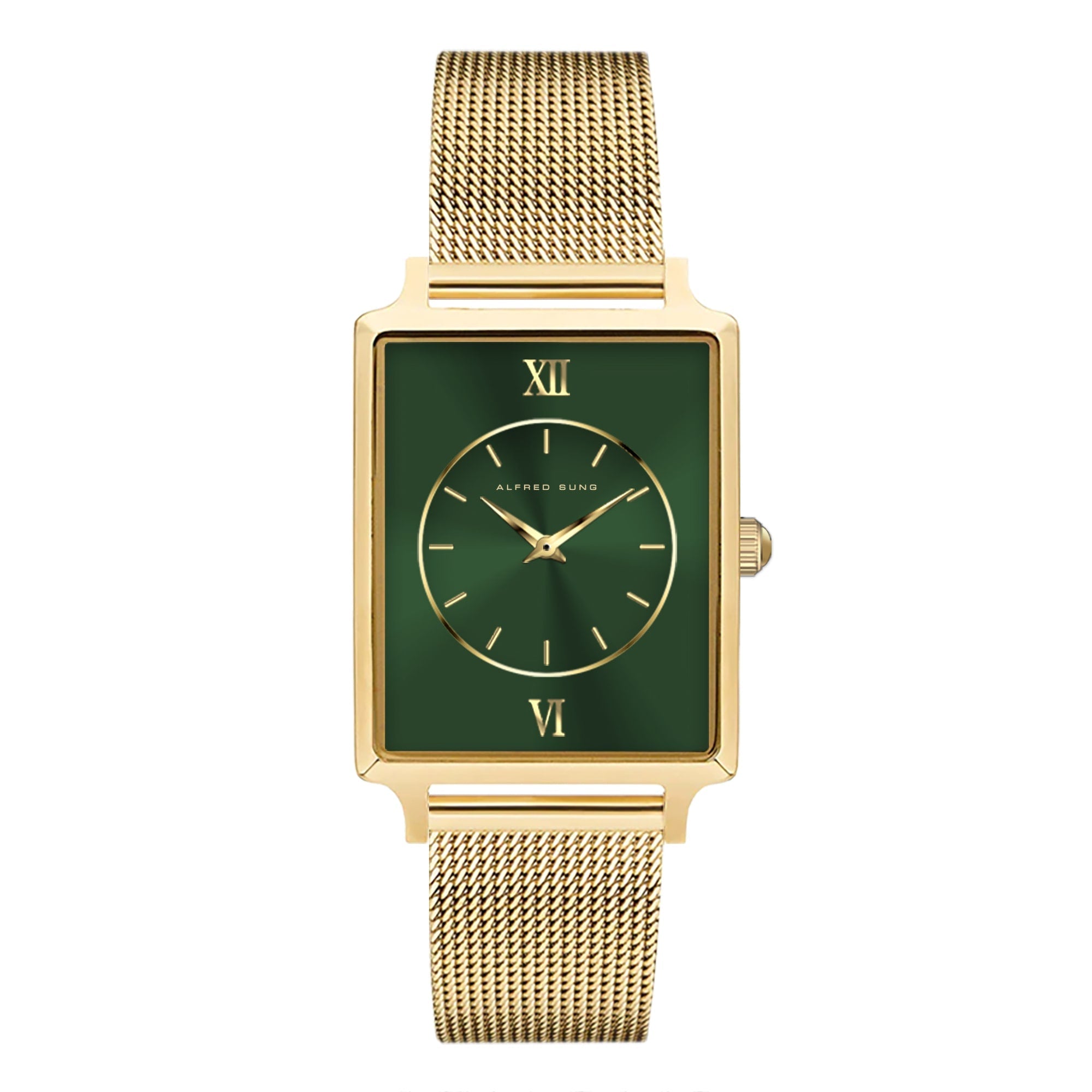 Elevate your style with the Alfred Sung Horizon Ladies Wristwatch. This exquisite timepiece features a sleek gold case and a matching stainless steel bracelet, perfectly complemented by a sophisticated green dial. Powered by precise Japanese movement, this watch is a testament to timeless elegance and modern design. Ideal for those who appreciate refined aesthetics, the Horizon collection embodies the perfect blend of functionality and luxury.