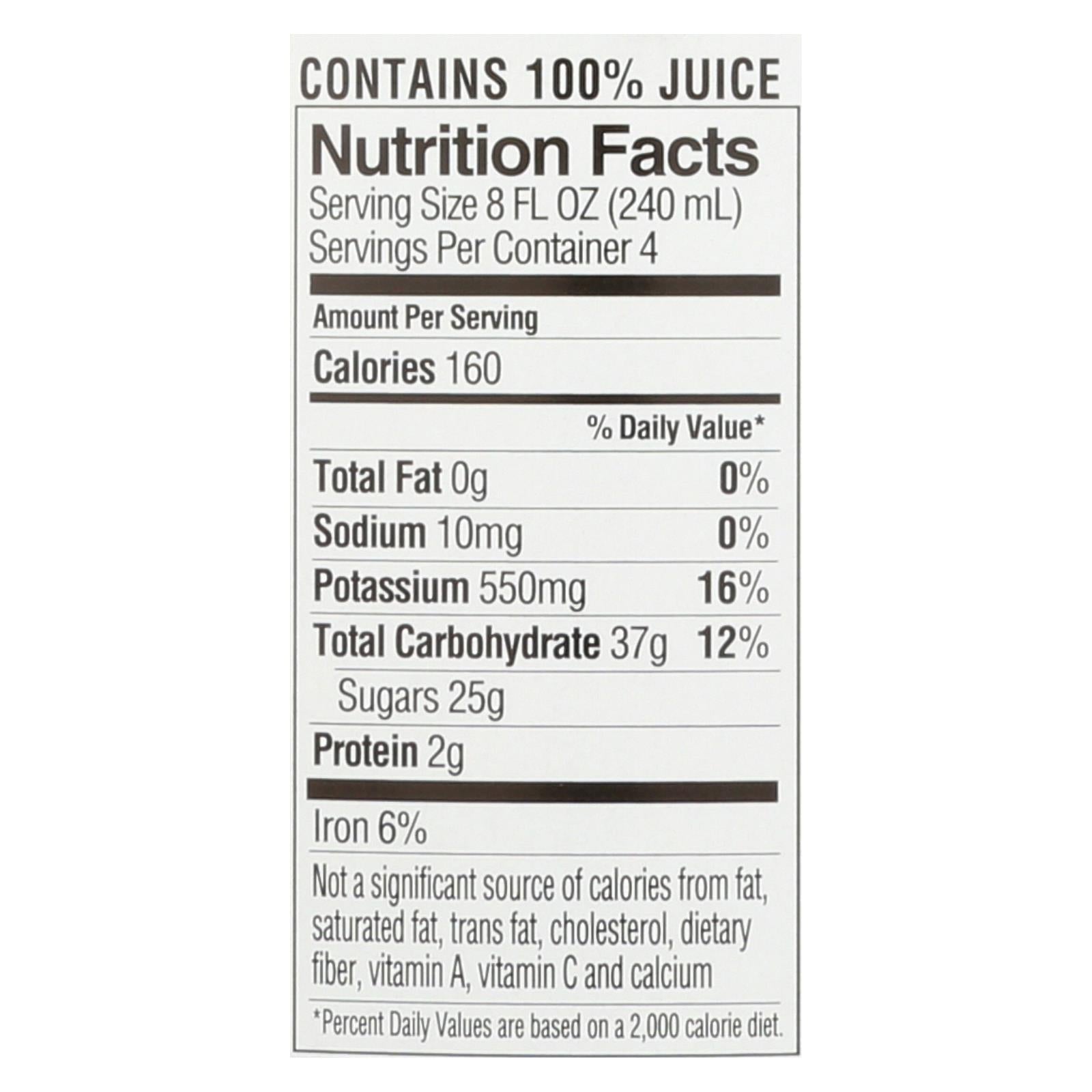 RW KNUDSEN JUST BLACK CHERRY JUICE IS MADE FROM FRESH BLACK CHERRIES AND DOES NOT CONTAIN ANY PRESERVATIVES OR ARTIFICIAL FLAVORS. EVERY 32 FL. OZ. CONTAINER IS UNSWEETENED AND MADE FROM 100% JUICE CONCENTRATE. EACH BOTTLE PROVIDES APPROXIMATELY FOUR SERVINGS AND EVERY SERVING CONTAINS 160 CALORIES.